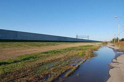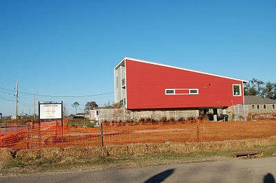 Yesterday, my brother- and sister-in-law met us for lunch and took us down to the ninth ward, the community most wiped out by the floods of Hurricane Katrina. (The hurricane didn’t do the damage, the flood occurred the next day when the man-made levees broke). Brad Pitt and some of his friends have begun a “green” rebuilding program there, and the houses are really cool. Still an awful lot of overgrown concrete slabs, however, where homes used to stand, right beside the levees.