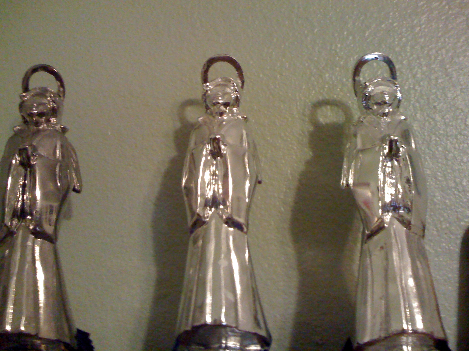 So earlier this week I put up the four shelves, lined up my little angels, and smiled at them. I’d painted the wall AND the shelves, so everything looked shiny and new. I was just beginning to clean up my mess when the two biggest shelves–the ones loaded with the angels–came crashing down on my head. Literally. I wasn’t hurt, but my wood floor will never be the same, and my poor angels! Out of the eight, only three of them now have intact halos. The others–well, they remind me even more of myself, because a halo is quite out of my reach. 🙂