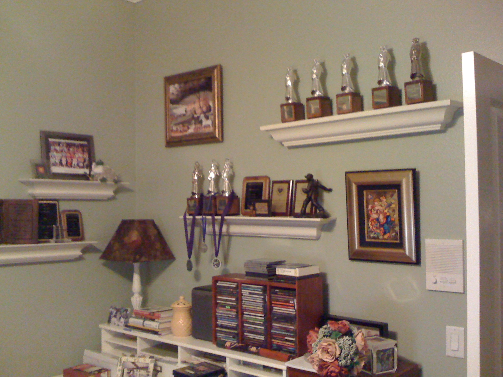 One story: I have an office wall that is decorated with shelves–I keep little things on it, along with awards, etc. In the past I have won eight “Angel Awards” from Excellence in Media. They don’t give the award any more, but I’m a little fond of my angels because of the name–Angel(a).