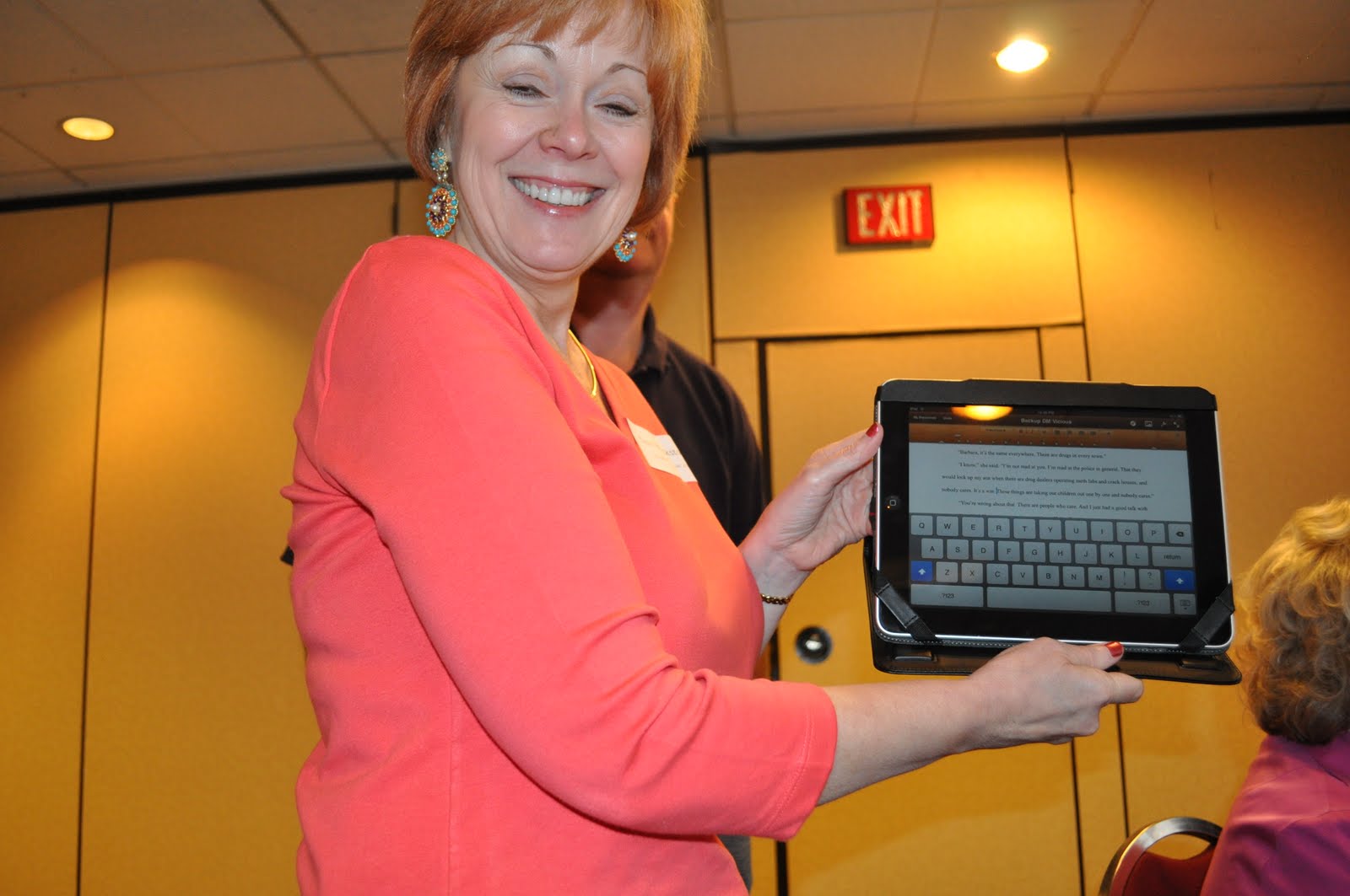 [Photo: Terri holds up her iPad.]