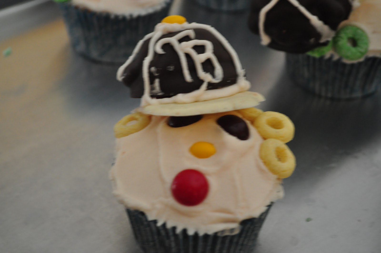 I pulled them together, but did have to make a couple of changes, none of which suited the cupcakes very well. The instructions called for the hats to be attached to the cupcake with a pretzel stick, and I didn’t have any. I “glued” the hats onto the cupcake with frosting, but had to do it at an angle which obscured most of the player’s “face.”