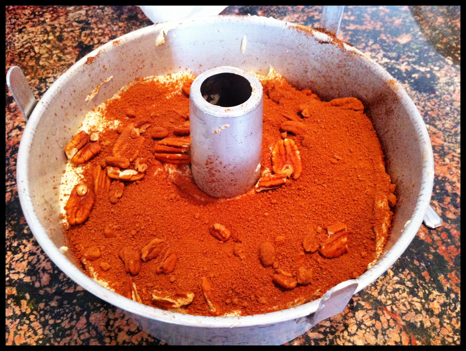 Anyway, I mixed in the eggs and vanilla, then alternated mixing the flour and sour cream. Then you spread half the batter in a tube pan, sprinkle with streusel, and then top with the remaining batter and more streusel. The concoction is baking now, so I’ll let you know how it comes out.