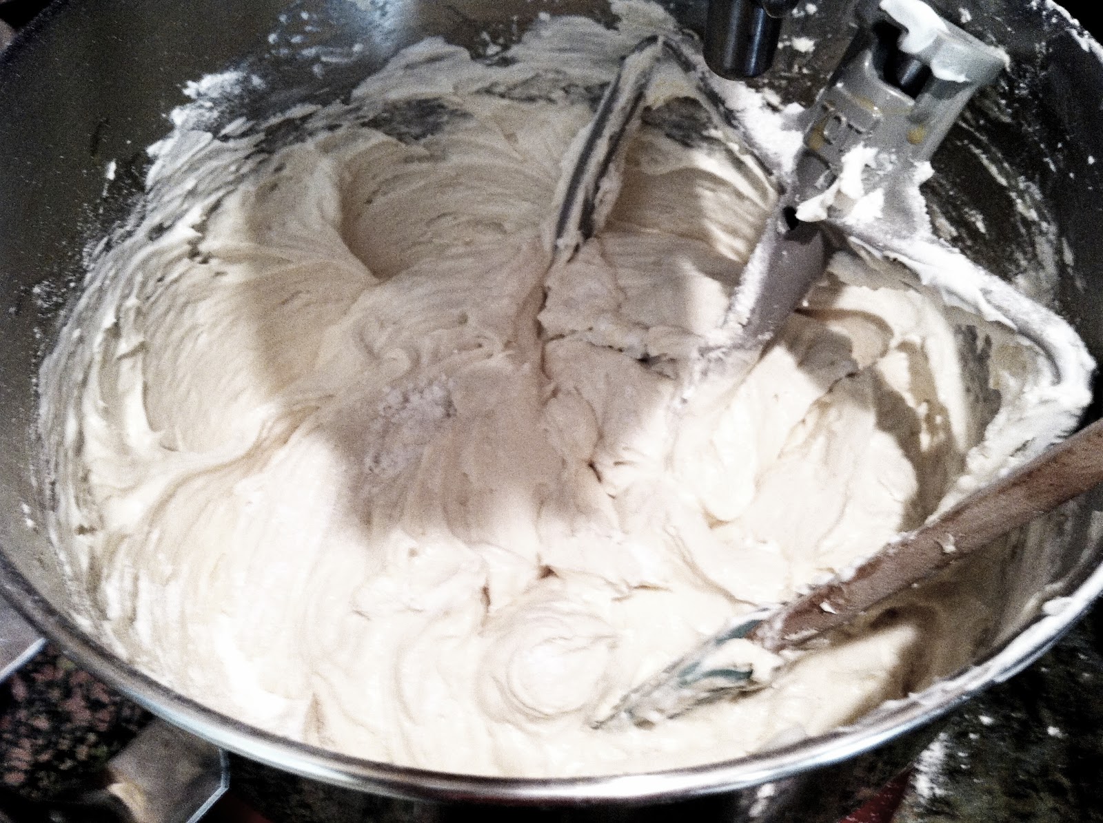 So you cream the sugar and butter, and then add the raw eggs by tablespoonful. Why? Because if you dump them all in at once, the batter will lose that lovely light consistency and “break” into a gelatinous mess. You can get it to whip up again, but “breaking” is considered a bad thing. If someone can explain this to me, I’m willing to listen.