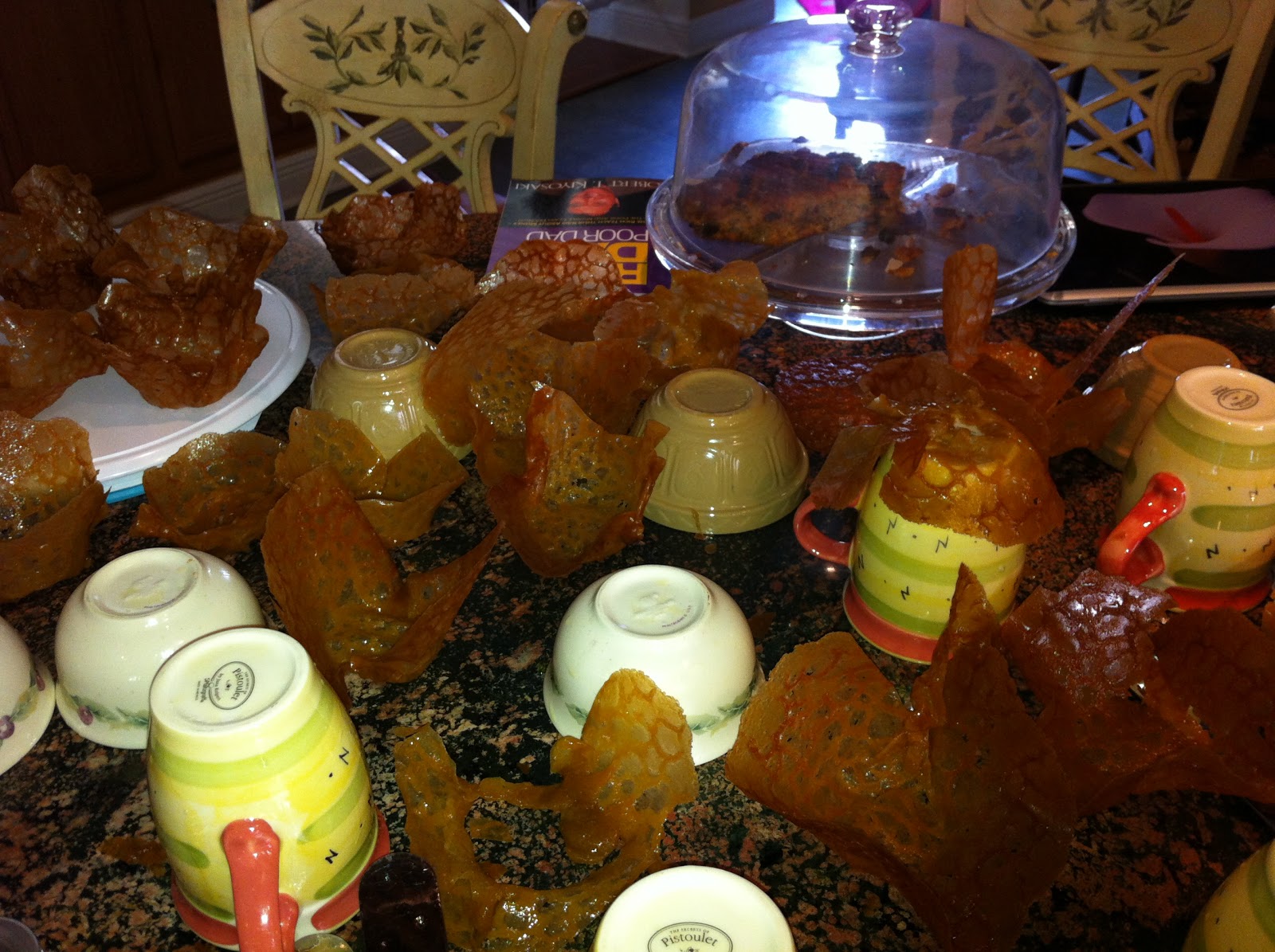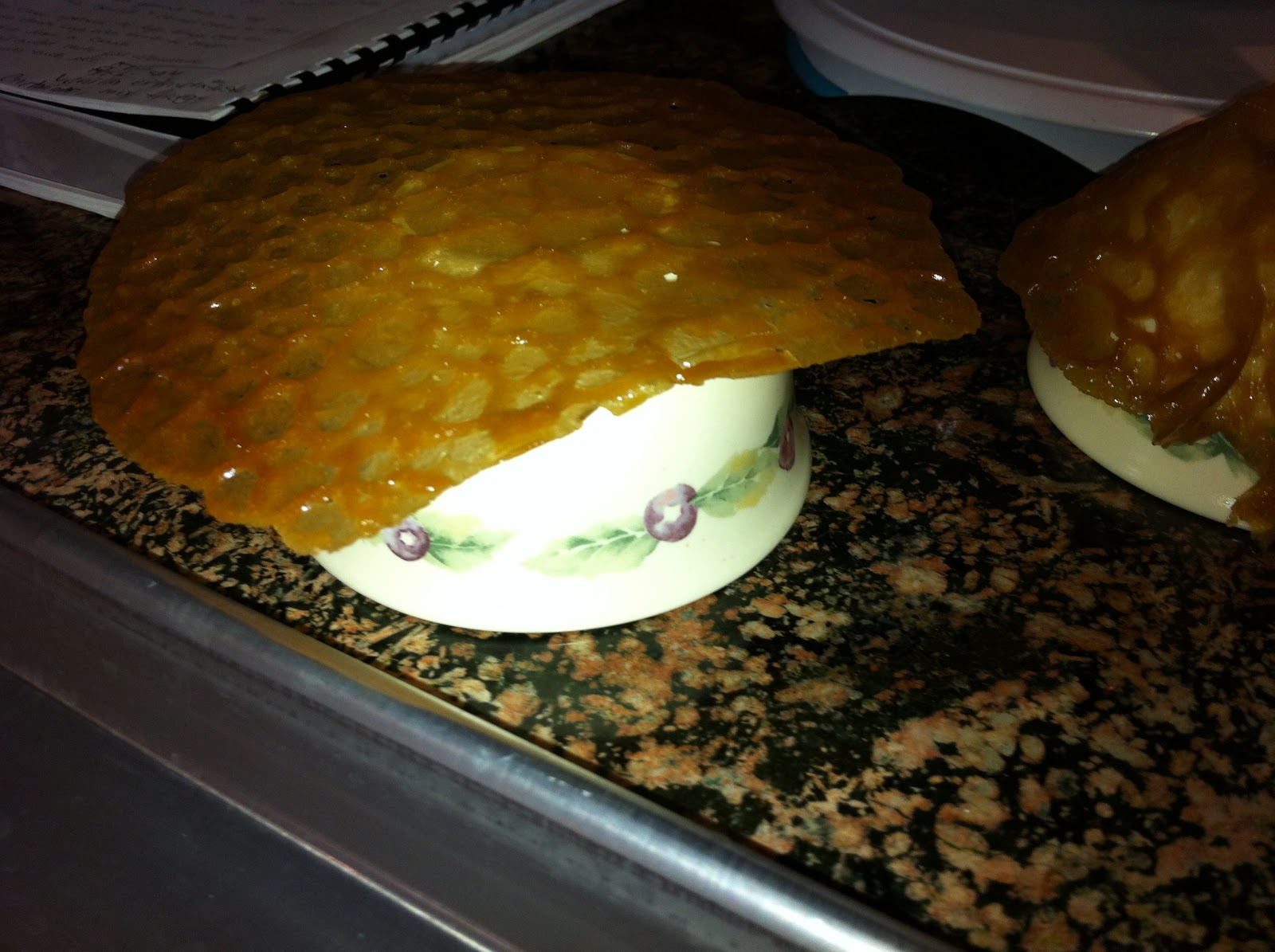 Lace doilies are made from a dough that’s mostly brown sugar, butter, and a wee bit of bread flour. Using a small ice cream scoop, you put a small lump (size of a ping pong ball) on a baking sheet. The lump will “melt” and spread out, then turn golden brown. Now comes the hard part–before the doily cools and sets, but after a minute so it’s not still goopy, you have to lift it off the baking sheet with cake lifters and mold it around a bowl or cup. As the mixture cools, the shape will set, resulting in lovely little bowls . . . they remind me of waffle cone bowls, but they’re more fragile.